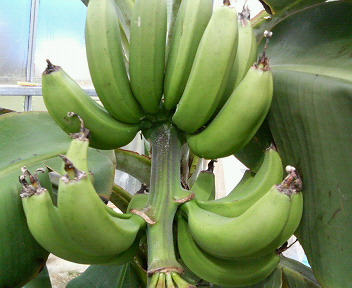 去年株分けしたうちの1株です。現在結実中の株は今年は株分けしないでそのままです。普通2株出てくるのですが1株は残してそのままにしておきます。バナナは結実するとその株は枯れてしまいます。 |